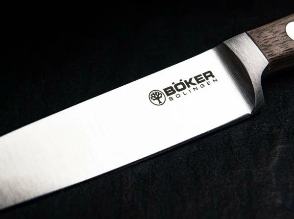 Böker erscheint im klassischen Drei-Nieten-Design und bietet ein ausgewogenes Verhältnis von Schnitthaltigkeit, Rostträgheit und guter Nachschärfbarkeit.