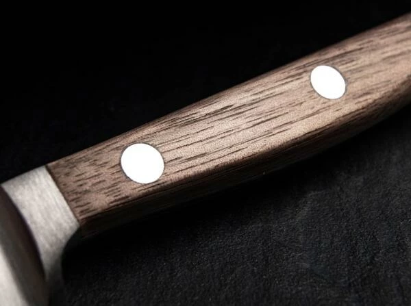 Durch die aufwendige Schmiedung in Solinger Handarbeit wird der massive Klingenrohling zusätzlich im Gefüge optimiert, anschließend auf ungefähr 58 HRC gehärtet und zuletzt mit einem feinen Satin-Finish versehen. Die ergonomisch geformten Griffe aus heimischem Walnussholz liegen sehr angenehm in der Hand und vervollständigen das stimmige Gesamtbild.