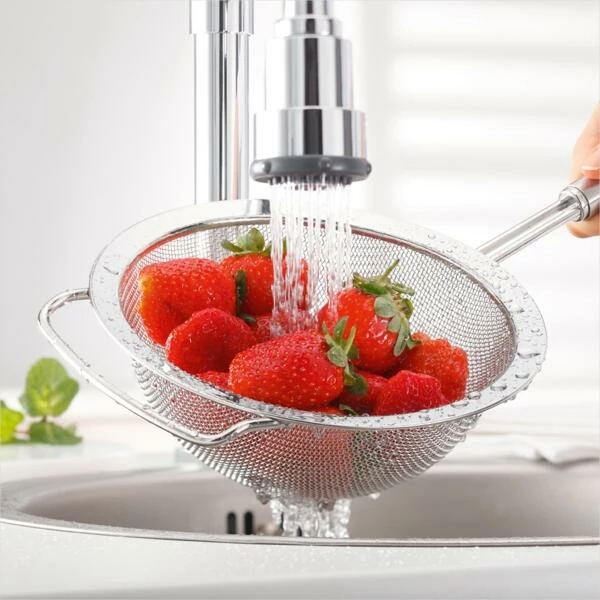 - zum Säubern von Salaten und Gemüse unter fließendem Wasser, da durch die großen Siebmaschen das Wasser schnell abfließen kann