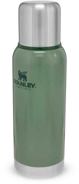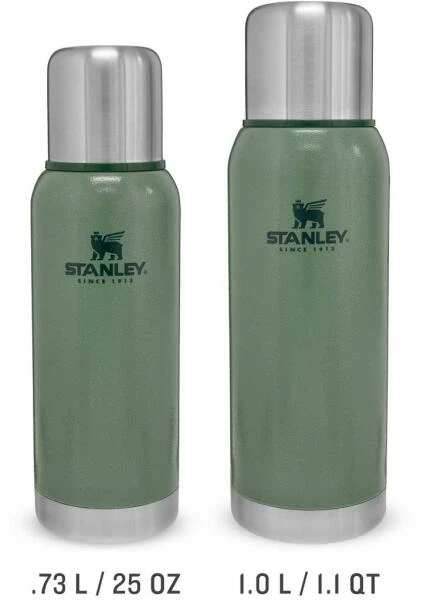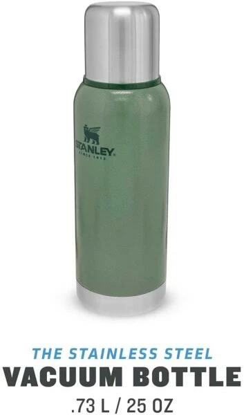 Diese doppelwandige Stanley ADVENTURE VAKUUM-FLASCHE wird aus rostfreiem Edelstahl gefertigt. Das Gehäuse ist mit einer robusten, grünen Hammerschlaglackierung versehen. Die doppelwandige Vakuum-Isolation hält Getränke bis zu 20 Stunden heiß oder kalt. Über dem Flaschenverschluss sitzt ein Trinkbecher, der ebenfalls isolierend ausgelegt ist. Durch die 5 cm weite Öffnung lässt sich die Flasche sehr gut reinigen. Fassungsvermögen: 0,739 Liter.