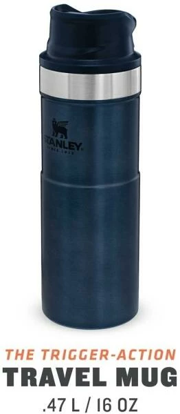 Mit dem Stanley CLASSIC TRIGGER-ACTION TRAVEL MUG in Nightfall Blue führt Stanley eine neue Generation der Becher mit Einhandbedienung ein. Das Drücken der großen und sehr leichtgängigen Taste zum Aktivieren der Trinköffnung mit einer Hand macht Trinken – on the go – zum Vergnügen. Der Trinkbecher aus rostfreiem 18/8-Edelstahl mit Vakuumisolierung besitzt ein Fassungsvermögen von 473 ml und hält Getränke bis zu 7 Stunden heiß oder sogar 10 Stunden gekühlt. Der TRIGGER-ACTION TRAVEL MUG ist komplett spülmaschinenfest, auslaufsicher und passt in gängige PKW-Getränkehalterungen. BPA-frei.