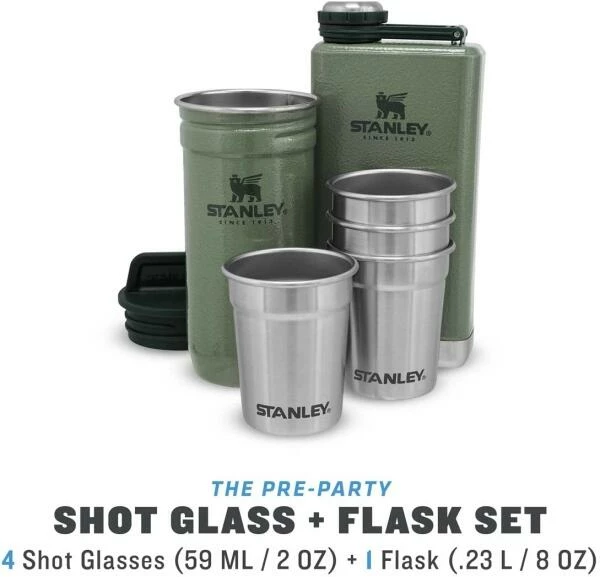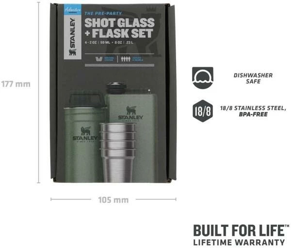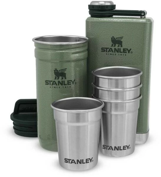 Das Stanley ADVENTURE SHOT + FLASK GIFT SET ist ein echter Hingucker. Das Set beinhaltet eine aus rostfreiem 18/8 Edelstahl gefertigte Taschenflasche mit einem Fassungsvermögen von 236 ml. Der Verschluss ist gesichert und geht so nicht verloren. Das Pintchen-Set besteht aus 4 Edelstahl Pintchen mit einem Fassungsvermögen von je 59 ml und einem Behälter zum Verstauen und Transportieren der Pintchen. Behälter und Taschenflasche in Hammerschlag-grün.
