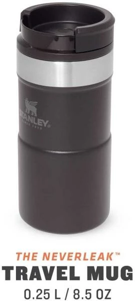 Mit dem Stanley NEVERLEAK TRAVEL MUG werden durch seine doppelwandige Edelstahl-Vakuumisolierung heiße Getränke bis zu 3 Stunden heiß und kalte Getränke bis zu 4 Stunden kalt gehalten. Der Trinkbecher aus rostfreiem 18/8-Edelstahl besitzt ein Fassungsvermögen von 250 ml und verfügt über einen einzigartigen 3-Positionen Deckel, der sich zum einfachen Trinken aufdrehen lässt und beim Schließen fest verriegelt. Der NEVERLEAK TRAVEL MUG ist komplett spülmaschinenfest, auslaufsicher und passt in gängige PKW-Getränkehalterungen. BPA-frei.