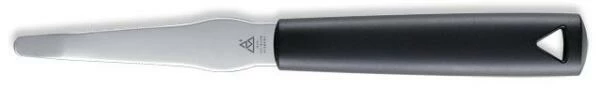 Die Klinge beidseitig geschärfte, halbrunde Klinge besteht aus rostfreiem Edelstahl, der Griff aus schwarzem Kunststoff.