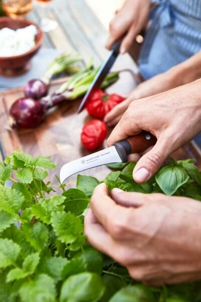 Der Helfer des wahren Food-Fans. Die eigenen Kräuter, selbstgezogenes Gemüse oder der Salat aus dem Balkonkasten: Wer nicht nur ein Händchen für Zubereitung und Zutaten, sondern gleichzeitig auch einen grünen Daumen hat, der setzt auf das Erntemesser. Mit der markanten Krümmung an der Spitze eignet sich diese einzigartige Klingenform ideal zum Ernten, Putzen und Schälen von Obst, Kräutern und kleinerem Gemüse.